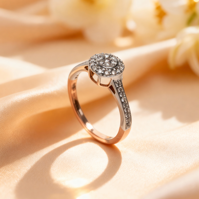 A timeless halo design that celebrates elegance in its purest form. The central diamond is encircled by a delicate halo, creating a radiant sparkle that elevates everyday moments into memories.