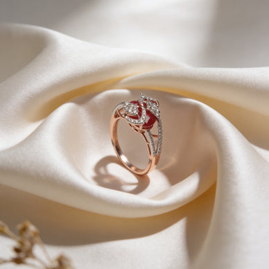 A bold red gemstone ring enhanced with sparkling diamond accents. A true symbol of passion and luxury.