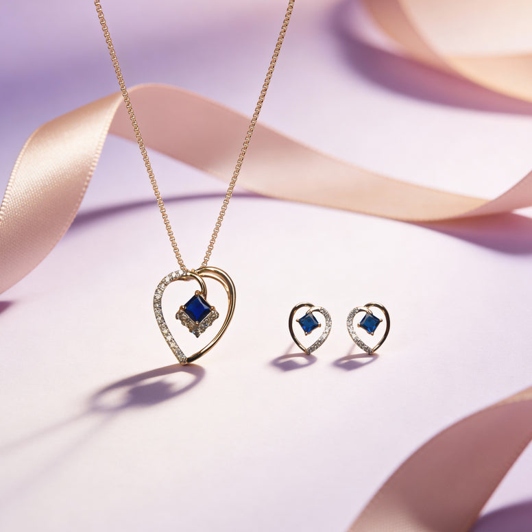A romantic open-heart pendant adorned with shimmering diamonds and a striking blue princess-cut stone at the center. Paired with matching heart studs, this set blends love and luxury beautifully.