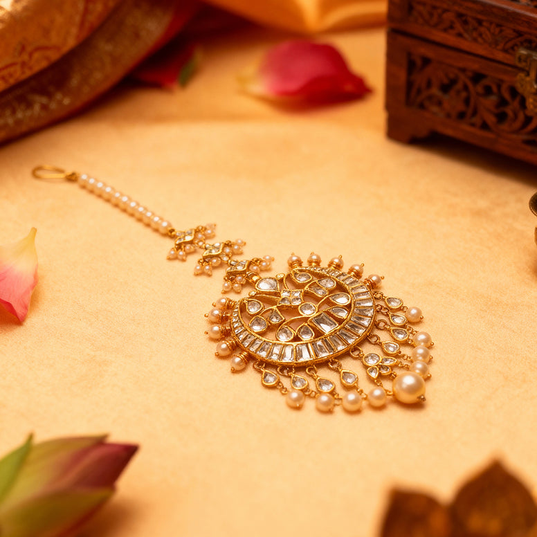 Crafted in a rich gold finish, its balanced silhouette makes it a refined yet eye-catching accessory for bridal and festive wear. A timeless ornament that complements lehengas, sarees, and heirloom jewellery with effortless elegance.