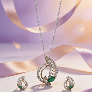 An Luxury open teardrop pendant featuring a vivid green marquise-cut stone embraced by a diamond-studded outline. Paired with matching studs, this set radiates freshness and sophistication.