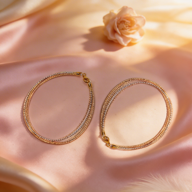 Inspired by soft golden sunlight on silk, the Golden Veil Anklet showcases multiple fine strands woven into one refined statement piece. Its layered texture reflects light beautifully, creating understated luxury.