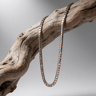 Crafted with precision, this hexagon-inspired chain blends silver and rose-gold tones for a striking yet balanced look. A versatile piece that transitions seamlessly from day to night.