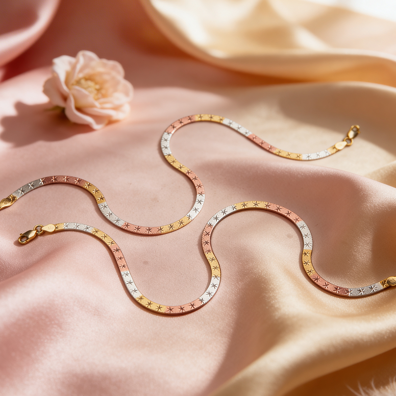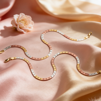 A graceful fusion of three tones in one delicate silhouette. The Trinity Glow Anklet features a sleek flat design with subtle star engravings, blending silver, rose, and golden hues beautifully. Minimal yet distinctive, it’s designed for everyday elegance with a modern twist.